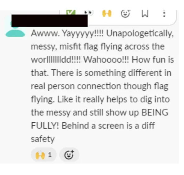 "Before ROAR I was feeling very paralyzed. The experience was mind-blowing. I realised I really need to lean into my vulnerability, softness, and honesty. I’ve been burned so many times, but I know living in this space is my best version of self. I will start with launching my Substack Home In the City, which I’ve been writing but not publishing. It’s about academic ideas and real life examples of what home means, and how it is so different from capitalistic ideas around materialistic possession and housing markets. It is tender and heart-led, which I have trouble with because it is so anti-academic, but I think it is what I should be writing. I was blown away with the amount of feedback and support on Slack from Kylie. Open heart + Open Mind = Open Opportunities."