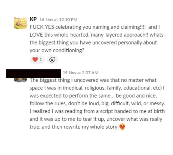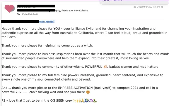 "Truly THANK YOU for holding such a compassionate space and helping my energy feel safe to come out in ways I didn't expect!!! (ummm - I came out as a witch on socials and to my family via text... whaattt). The way you hold space inspires the fuck out of me, and I can't wait to work with you again. I feel like I've been reborn in many ways. I didn't realize how much my soul wanted to "come out" as a witch, but now that it's out there - I know this is a deeply important step for me moving the needle on my business forward. I have no idea where it's taking me, and honestly - surrendering to the process is a part of this I know I need / want to lean into.... So I'm here for it. I feel more able to be SEEN than ever before - thank you :)"