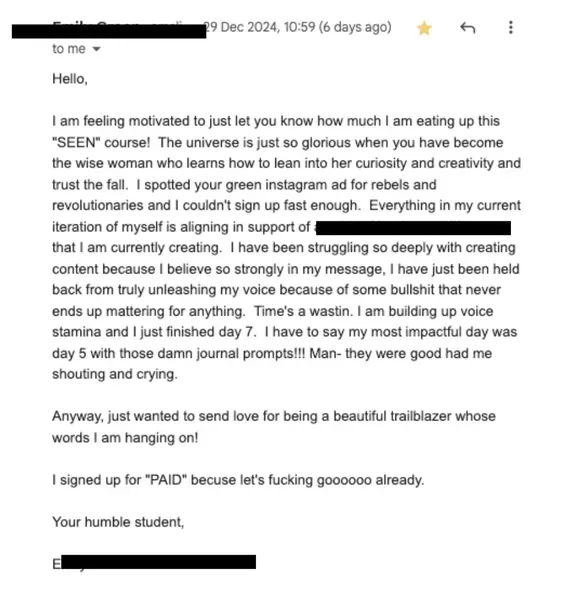 You’ll receive a $500 invitation code to join GSPOT – my signature storytelling + messaging experience – once you begin SEEN. Your next step will be waiting in your inbox.