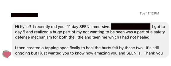 "I learned that there is nothing wrong with my broken tender heart. "Inside SEEN, I learned that I can be vulnerable and messy and the world isn't going to fall apart and I'm not going to hurt or damage people. I learned that one of my superpowers is rest and renewal and that should be a central theme in my messaging. I learned that there is nothing wrong with my broken tender heart. I learned again, that I have a lot to share and offer and I can get up and do it again. Now, I understand my business has its own energy, and I need to talk to her and see what she needs me to do and how I can help her, and that it needs to be something that I channel, instead of something that I go get from other people."