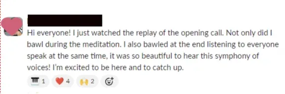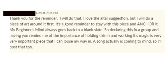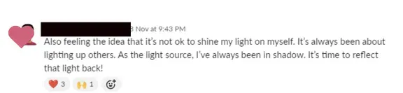 "I haven't been racing after results, I'm moving from inspired action. I released a burden that a young part of me had been carrying for a long time about a fear of other people's judgments - that part is now feeling free to play and be herself. And the wise woman archetype that I connected with continues to be a touchstone for me internally. Translating that deep work into the business has been a slower unfolding, but I'm in a bigger process of trusting the process of life unfolding perfectly. So I haven't been racing after results, I'm moving from inspired action :)"